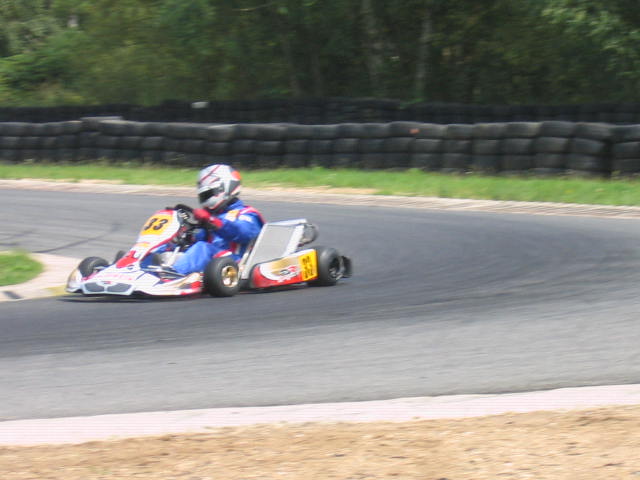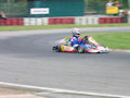 Am frühen Morgen war man geteilter Meinung, ob man die Regenreifen oder doch die Slicks aufziehen sollte. Ich entschied mich für Slicks, was sich auch als eine gute Wahl bei dem Warm-Up am Sonntagmorgen herausstellte. Aufgrund dieses Wissens dachten ich und mein Teamchef auch, dass wir das erste Rennen mit den Slicks bestreiten können. Doch das war falsch gedacht. Nach dem Warm-Up der Klasse KF3 folgten noch 5 weitere Klassen mit ihrem Warm-Up und deswegen kam immer mehr Gummi auf die Strecke, welches diese um einiges rutschiger machte. Von 23 Startern in der KF3 entschieden sich 6 für Regenreifen. Das Rennen wurde mehr zum Chaosrennen als zu einem geregelten Rennen. Nach einer Startkarambolage, an der ich knapp vorbei kam, fand ich mich kurzzeitig auf Platz neun wieder. Jedoch wurde mir die Dummheit eines anderen Fahrers zum Verhängnis, als dieser mir nahezu ungebremst ins Kart fuhr und mich damit von Platz neun auf Platz 23 abschoss. Mit einer konzentrierten Aufholjagd konnte ich am Ende einen passablen 16. Platz zu Buche schreiben.